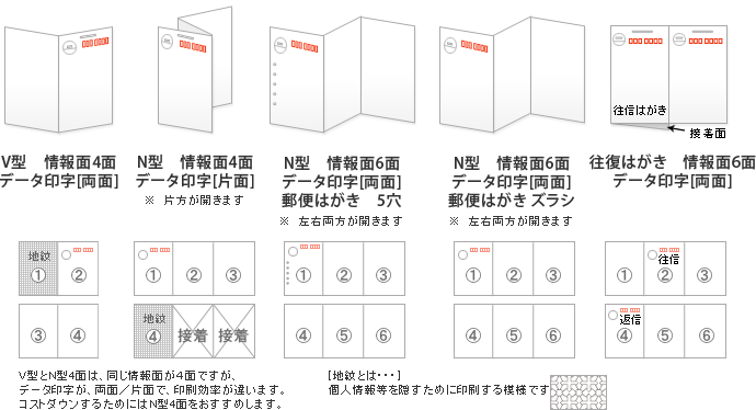 V型圧着はがきは、紙を二つ折りにして圧着するシンプルなタイプです。N型より情報量は少ないものの、開封が簡単で、短いメッセージや強調したいポイントを伝えるのに適しています。